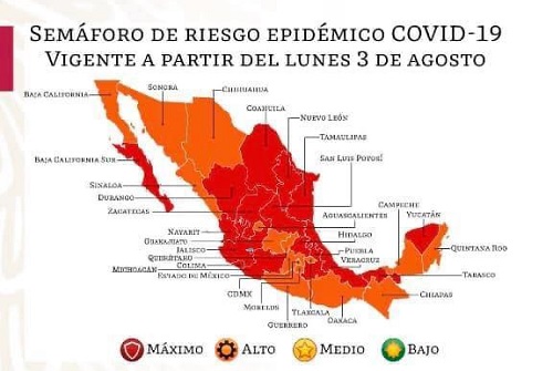 El Dr. Hugo López-Gatell Ramírez, Subsecretario de Prevención y Promoción de la Salud del Gobierno de la República, informó que a partir de hoy lunes 3 de agosto, las entidades en semáforo NARANJA son: Aguascalientes, Baja California, Campeche, Chiapas, Chihuahua, Ciudad de México, Estado de México, Guanajuato, Guerrero, Morelos, Oaxaca, Querétaro, Quintana Roo, Sinaloa, Sonora y Tlaxcala.