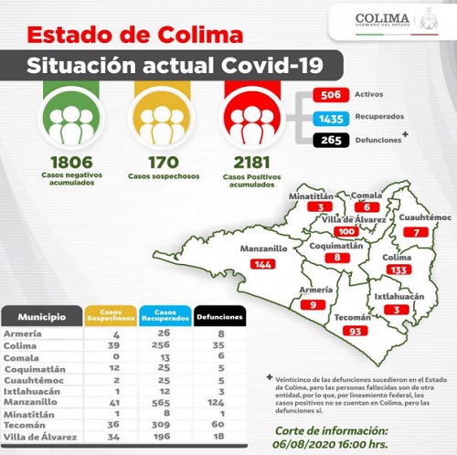Las instituciones del Sector Salud reportaron que este jueves 6 de agosto se registraron 39 nuevos casos y 6 defunciones por Covid-19, con lo que el estado alcanza 2181 casos y 265 decesos acumulados por esta causa en la entidad.