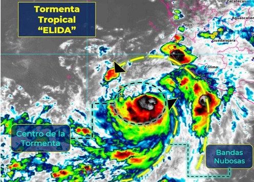 “Élida” ya produce lluvias muy fuertes a puntuales intensas, con vientos fuertes y oleaje de 2 a 3 metros en los litorales de Nayarit, Jalisco, Colima y Michoacán.