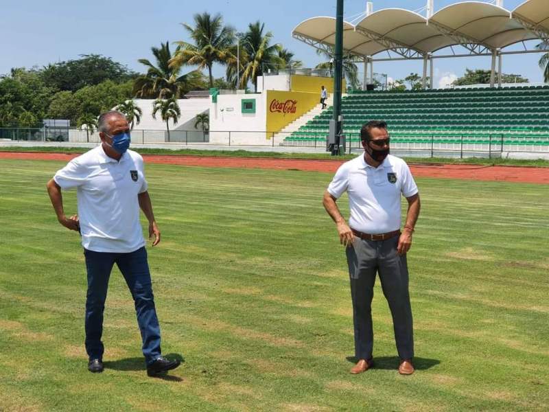 El presidente del equipo Colima Futbol Club F.C llamado “Los Caimanes”, Sergio Bueno, acompañado por Rodolfo "Fatty" Navarro, Director de Nuevos Proyectos supervisaron y constataron las condiciones en las que se encuentra el césped del Estadio Olímpico Universitario junto con las instalaciones.