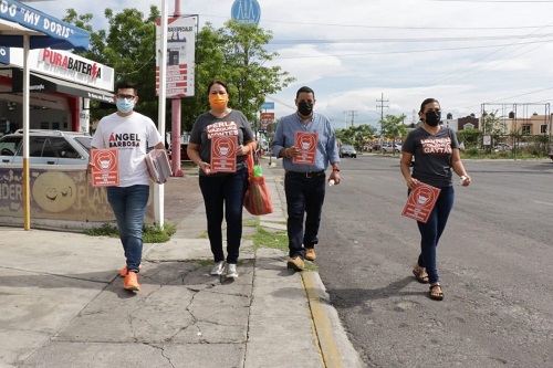 Villa de Álvarez, Col. Con la finalidad de generar una mayor conciencia sobre del uso de cubrebocas entre clientes y empleados de distintos negocios establecidos a lo largo de la avenida Ayuntamiento en el municipio de Villa de Álvarez, los regidores Perla Vázquez Montes, Mayrén Polanco Gaytán, Miguel Ángel Barbosa y Josué Vergara Santana entregaron este lunes señalética que especifica la obligatoriedad del uso del cubrebocas dentro de los establecimientos, además de regalar paquetes de tanto a clientes como a empleados.
