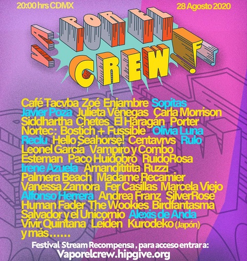 *Café Tacvba, Zoé, Enjambre, Julieta Venegas, Hello Seahorse! y El Haragán serán parte, junto a muchas bandas más, del show virtual este 28 de agosto a las 20:00 hrs. (CDT) *¡Va por el crew! busca recaudar fondos para entregar apoyos a 300 trabajadoras y trabajadores de la industria de conciertos afectados por la cancelación de eventos en México *Las personas que quieran acceder al concierto deberán donar a la campaña antes del 27 de agosto a las 14:00 hrs. (CDT) en https://vaporelcrew.hipgive.org