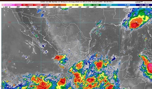 Hoy lunes 24 de agosto, una zona de baja presión con alta probabilidad de desarrollo ciclónico, asociada con la Onda Tropical Número 30, ambas con desplazamiento paralelo a las costas de Oaxaca, ocasionarán lluvias puntuales torrenciales (de 150 a 250 milímetros), descargas eléctricas y fuertes vientos en Chiapas, Oaxaca y el sur de Veracruz,