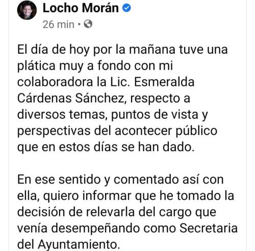 El alcalde de Colima, Leoncio Morán Sánchez, dio a conocer, mediante sus redes sociales, la decisión de relevar del cargo a Esmeralda Cárdenas Sánchez, quien hasta este lunes se desempeñaba como Secretaria del Ayuntamiento de Colima.