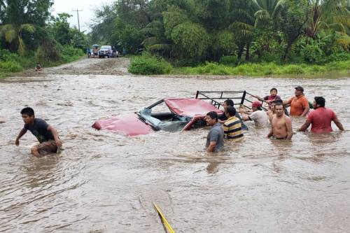 Aquila, Mich. Este viernes, desde la localidad de Maruata se informa que la gran crecida del río originada por las lluvias de la tormenta tropical Hernán, dieron lugar a que este jueves una camioneta pick up de modelo atrasado fuera arrastrada por la corrientada.
