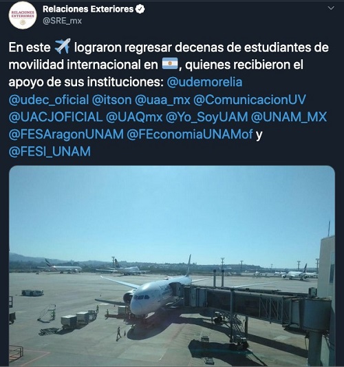 La SRE informó que en este vuelo lograron regresar decenas de estudiantes que estaban de movilidad internacional en Argentina, quienes recibieron apoyo de sus instituciones como la Universidad de Colima, Universidad Morelia, Instituto Tecnológico de Sonora, Universidad Autónoma de Aguascalientes, Universidad Veracruzana, Universidad Autónoma de Ciudad Juárez, Universidad Autónoma de Querétaro, Universidad Autónoma Metropolitana, y de la UNAM.