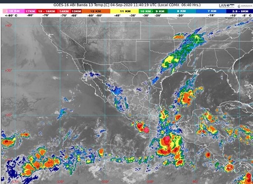 Un segundo canal de baja presión propiciará lluvias puntuales muy fuertes en Hidalgo y Querétaro; fuertes en Colima, Estado de México, Michoacán, Morelos, Tlaxcala y Yucatán.