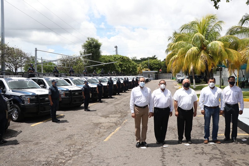 El gobernador, José Ignacio Peralta Sánchez, hizo entrega de 15 patrullas y equipamiento para la policía estatal, consistente en 200 coderas, 200 rodilleras, 200 googles tácticos, 200 guantes, 25 cascos para motocicleta, mil 418 botas, 350 fornituras y 709 cinturones tácticos.