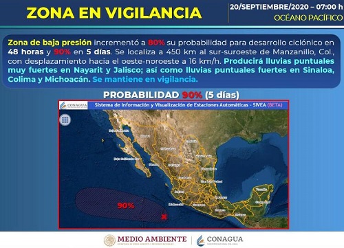 Una Zona de baja presión que se localiza al suroeste de las costas de Jalisco y Colima, producirá lluvias puntuales muy fuertes en Nayarit y Jalisco; así como lluvias puntuales fuertes en Sinaloa, Colima y Michoacán.
