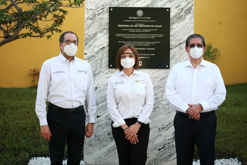 La placa dice: “La Universidad de Colima, en el 80 aniversario de su fundación, rinde honores al personal de los servicios de salud que realiza acciones para atender a la sociedad colimense durante la pandemia ocasionada por el COVID-19. La develación de esta placa es prueba a la vez que testimonio, de nuestro reconocimiento a su ética, entrega y servicio con responsabilidad social, que han significado sacrificios personales, familiares y en algunos casos la vida misma. Especialmente honramos a nuestras egresadas y egresados de las profesiones del área de la salud por cumplir con su compromiso social y practicar los valores universitarios. Nuestro compromiso y gratitud”.