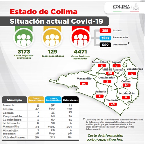 Las instituciones del Sector Salud en el estado reportan que este martes 22 de septiembre, se registraron 9 nuevos casos y 5 defunciones por Covid-19, con lo que total, hay 4 mil 471 casos y 550 decesos acumulados por esta causa en Colima.