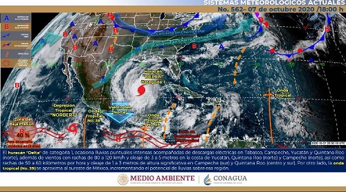 Mañana jueves, el huracán “Delta” se desplazará sobre el Golfo de México, intensificándose gradualmente, el sistema continuará con su trayectoria hacia Luisiana, Estados Unidos.