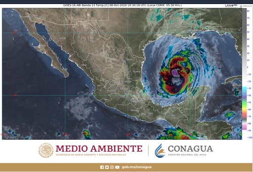 Hoy jueves 8 de octubre, el huracán “Delta” se desplazará sobre el Golfo de México, con trayectoria hacia Luisiana, E.U.A.; su extensa circulación, en interacción con un canal de baja presión, originará lluvias muy fuertes en Tabasco y Chiapas.