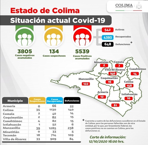 Las instituciones del Sector Salud en el Estado reportan que este lunes 12 de octubre, se registraron 70 nuevos casos y 8 defunciones por Covid-19, con lo que se alcanzan los 5 mil 539 casos y 648 decesos acumulados por esta causa en la entidad.