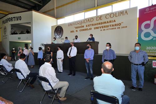 Además, se tomó protesta a las y los nuevos consejeros universitarios, en evento presencial realizado en el polideportivo del campus Colima, donde se observaron todas las recomendaciones del Protocolo de Seguridad Sanitaria de la Institución y de los organismos del sector salud.