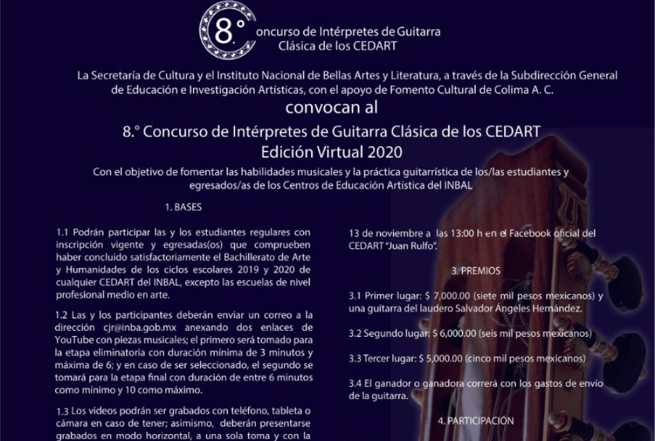 El Centro de Educación Artística CEDART “Juan Rulfo”, dio a conocer la convocatoria nacional del “8° Concurso de Intérpretes de Guitarra Clásica de los CEDART”, y el “4to Concurso de Pintura Mural “Juan Rulfo”, actividades que serán a distancia y dirigidas a las y los estudiantes regulares y egresados/as de las generaciones 2019 y 2020.