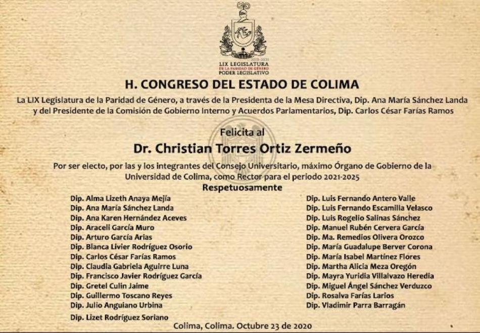 Las Diputadas y Diputados del Congreso del Estado de Colima felicitaron a través de las redes sociales a Torres Ortiz Zermeño por haber sido electo la víspera como Rector de la Universidad de Colima para el periodo 2021-2025.