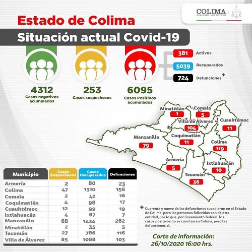 Las instituciones del Sector Salud en el Estado reportan que este lunes 26 de octubre se registraron 13 nuevos casos y 5 defunciones por Covid-19, con lo que Colima alcanza los 6 mil 095 casos y 724 decesos acumulados por esta causa.