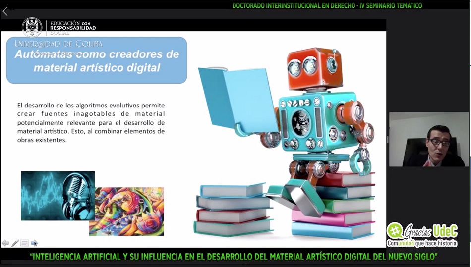 Al término del acto inaugural, Manuel Niebla Zatarain, docente en la Universidad Autónoma de Sinaloa dictó la conferencia “Inteligencia artificial en el desarrollo de material artístico digital en el nuevo siglo”, en la cual expuso que el internet impactó en todos los aspectos de la vida cotidiana; sin embargo, agregó, “más allá de los aparentes beneficios que el ciberespacio otorgaba, también fue escenario prolífico para la generación de nuevas conductas que van en contra del marco normativo, pues pocas áreas del Derecho resintieron el impacto negativo del uso ilegítimo del internet sobre la propiedad intelectual y los derechos de autor”.