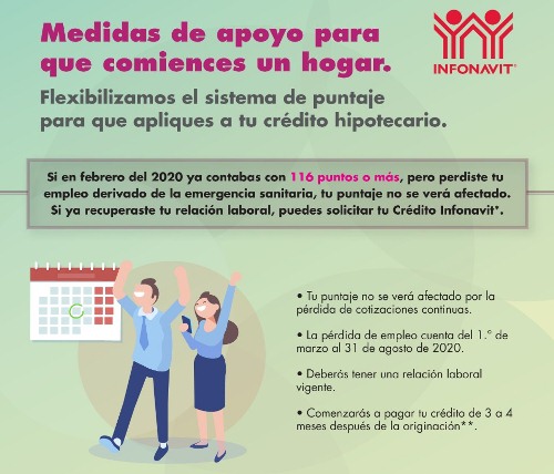 Asimismo, el Consejo de Administración autorizó la flexibilización del sistema de puntaje, con el objetivo de que los derechohabientes que ya habían iniciado su solicitud de crédito y se desperfilaron por la pérdida de su relación laboral a causa de la emergencia sanitaria por Covid-19, puedan continuar con la adquisición de su vivienda, siempre y cuando recuperen el empleo antes del 31 de enero de 2021.