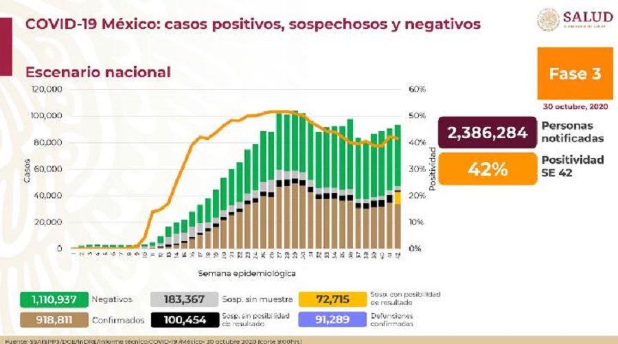 El Subsecretario de Prevención y Promoción de la Salud, Dr. Hugo López-Gatell Ramírez informó esta noche que al corte de hoy viernes 30 de octubre de 2020, en la República Mexicana hay 918,811 casos confirmados de Coronavirus SARS-CoV-2.