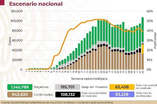 El Subsecretario Hugo López-Gatell Ramírez informó que al corte de hoy miércoles 4 de noviembre, en la República Mexicana hay 943 mil 630 casos confirmados de Coronavirus.