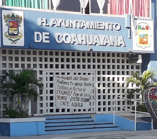 En Coahuayana el magisterio democrático en el Palacio Municipal solo permite la entrada a las personas que van a los cajeros bancarios, “para no afectar a la gente que necesita sacar dinero pues son los únicos cajeros en el municipio”.