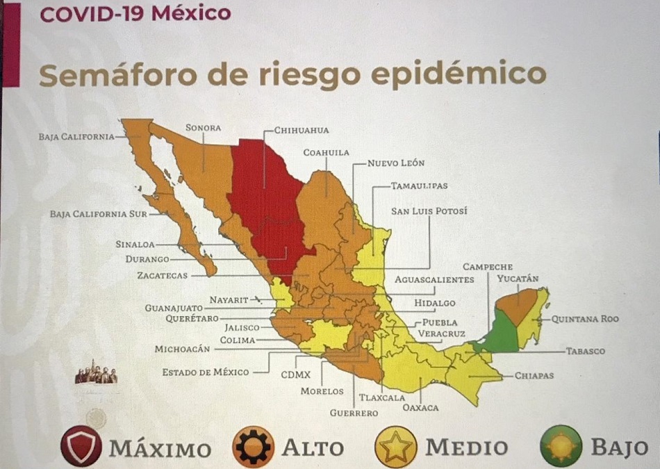 Cabe destacar que en el ámbito nacional hay dos estados en color rojo que significa riesgo máximo, 18 en color anaranjado, que es riesgo alto, se tiene también 11 en color amarillo correspondiente a riesgo medio y continúa Campeche siendo la única entidad en color verde que es riesgo bajo.