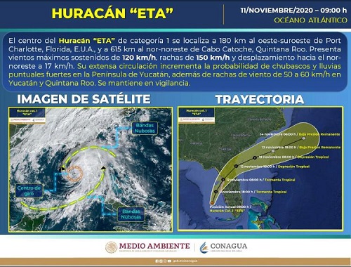 “Eta” se mantiene como Huracán de categoría 1 en la Escala Saffir-Simpson y se localiza al momento a 180 km al oeste-suroeste de Port Charlotte, en Florida, Estados Unidos, y a 615 km al nor-noreste de Cabo Catoche, Quintana Roo.