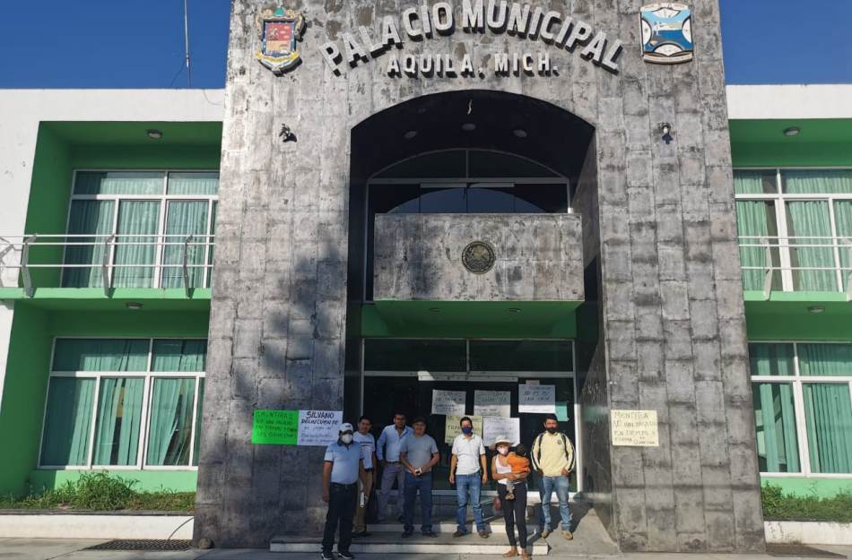 Aquila, Mich. Este miércoles por la mañana, personal sindicalizado de Telebachilleratos de la costa / sierra nahua michoacana, tomaron el edificio del Palacio Municipal aquilense, en demanda de que el Gobierno de Michoacán les cumpla con sus demandas entre las que destacan las peticiones económicas de que se les pague a tiempo y completo su salario, así como otras prestaciones que se le adeudan.