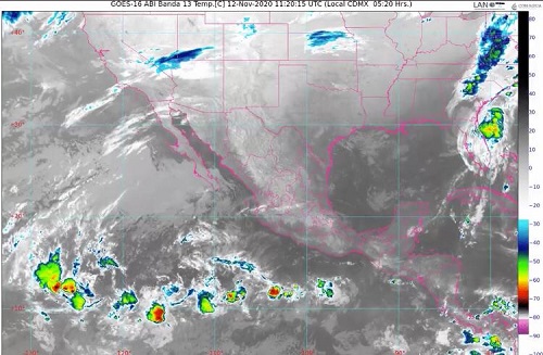 Hoy jueves 12 de noviembre, un canal de baja presión extendido sobre el sur del Golfo de México ocasionará lluvias puntuales fuertes (de 25 a 50 milímetros) en zonas montañosas de Oaxaca, Puebla y Veracruz.