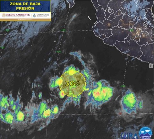La Comisión Nacional del Agua, a través del Servicio Meteorológico Nacional, reporta que la Zona de Baja Presión en el Océano Pacífico aumentó 30% su probabilidad para desarrollo ciclónico en el pronóstico a 48 horas.