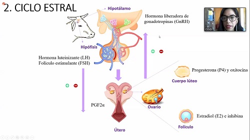 Este ciclo, explicó, consta de cuatro etapas: Estro, Metaestro, Diestro y Proestro. Se puede dividir en dos fases que involucran la fase folicular y la fase lútea o secretora; “si las personas que trabajan directamente con estos animales comprendan cómo funcionan las hormonas, dónde se producen y cómo actúan en el animal, podrán entonces implementar tratamientos hormonales, así como conocer si el animal está teniendo un ciclo estral normal para alcanzar el éxito en la eficiencia reproductiva”.