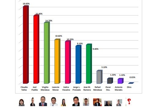 Incluso en la pregunta realizada por la encuestadora: Si en estos momentos fueran las elecciones para Gobernador ¿Podría decir por quién votaría usted independientemente del partido al que pertenece? En donde el 18.60 por ciento de las personas encuestadas contestaron que su voto sería por Claudia Yáñez Centeno, mientras que el 16.40 prefirieron a Joel Padilla, dejando en tercera posición a Virgilio Mendoza con el 14.40 por ciento y a Leoncio Morán Sánchez con el 10:60 por ciento de las preferencias.
