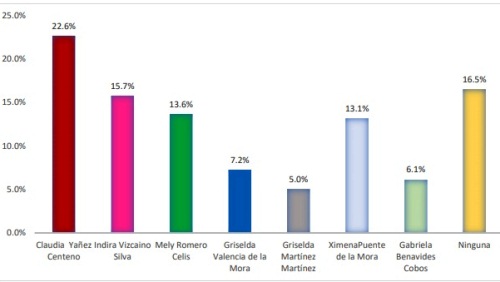 Mientras que en la pregunta: Si estuviera en sus manos elegir a una mujer para que fuera la próxima Gobernadora del Estado, ¿Por quién se decidiera de las siguientes mujeres? Siendo nuevamente Claudia Yáñez quien encabezó las preferencias con el 22.60 por ciento, Indira Vizcaíno Silva obtuvo el 15.70%, Mely Romero Celis el 13.6%, Griselda Valencia de la Mora el 7.2%, mientras que Griselda Martínez Martínez alcanzó el 5%, Ximena Puente de la Mora el 13.1 por ciento y Gabriela Benavides Cobos el 6.1 por ciento.