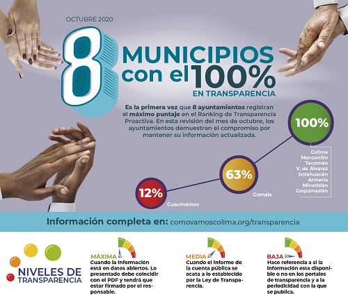 Transparencia máxima. Es la primera ocasión en que 8 ayuntamientos: Colima, Manzanillo, Tecomán, Villa de Álvarez, Ixtlahuacán, Armería, Minatitlán y Coquimatlán logran registrar un porcentaje del 100 por ciento, cabe señalar, que anteriormente este puntaje había sido alcanzado solo por 7 municipios. En el análisis anterior, Minatitlán se quedó a 4 puntos porcentuales del nivel más alto pero ya se encontraba en proactividad.