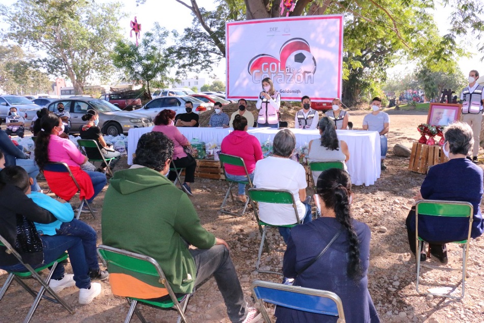 La presidenta del Patronato DIF y Voluntariado Estatal, Margarita Moreno González, encabezó la entrega de dotaciones alimentarias del programa Gol de Corazón, en el marco del primer aniversario luctuoso de Jimmy Goldsmith, a manera de homenaje, ya que este programa nació gracias a la generosidad del empresario.