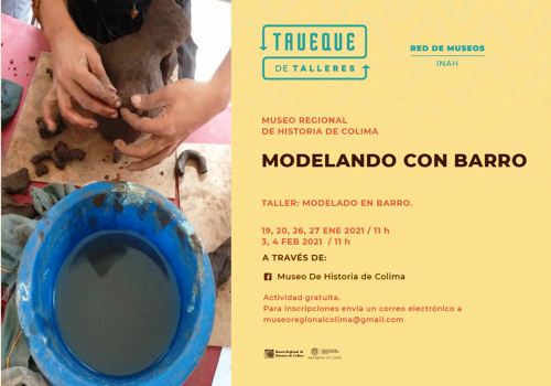Como parte del programa Trueque de talleres, coordinado por el Museo Regional de Historia de Colima a través de la red de museos del INAH, en el que los distintos espacios culturales del país, ofertan sus actividades en línea, el próximo 19 de enero dará inicio el taller Modelando con barro, dirigido por Gloria Paz y Francisco Martínez, del área de comunicación educativa del museo en mención, y la participación del maestro David Alva, quien constantemente colabora en las actividades de este recinto cultural.