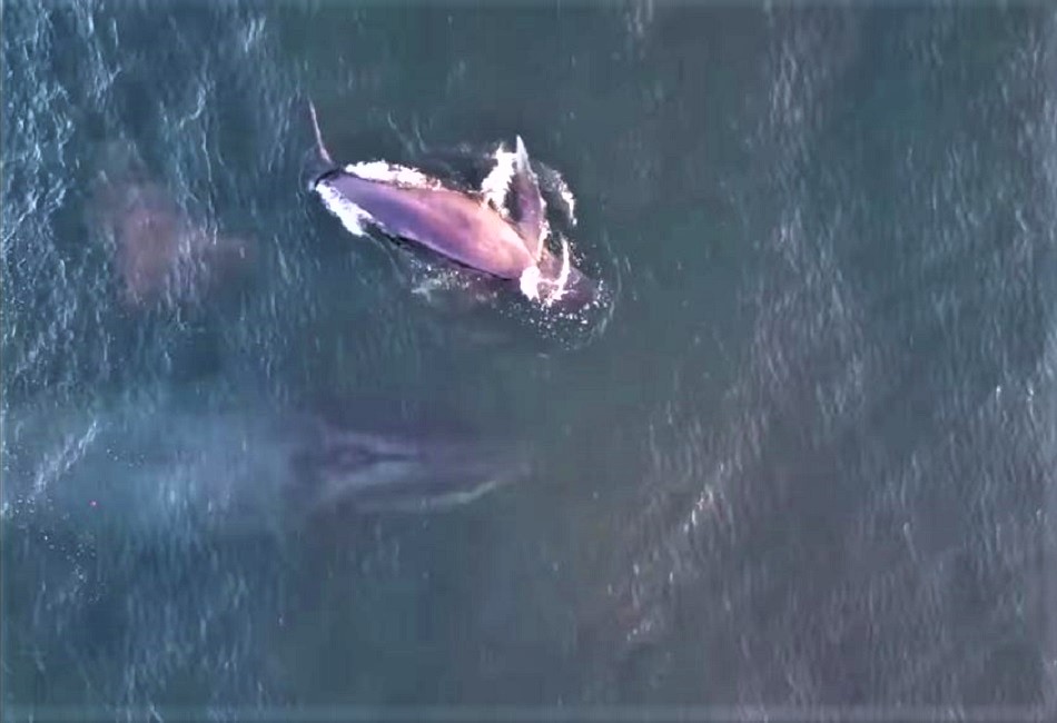 “Estaba como a 800 metros de la costa, y volé mi dron para acercarme y para mi sorpresa es que no era una sino dos mamíferos, una ballena acompañada de su ballenato”, señaló.