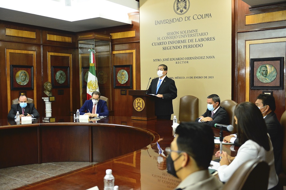 Con un resumen de los logros alcanzados durante los ocho años al frente de la Universidad de Colima, este viernes el rector José Eduardo Hernández Nava rindió su cuarto informe de labores del segundo período, en sesión solemne realizada ante el pleno del Consejo Universitario, máximo órgano de gobierno de la institución, en el que destacó como estrategia principal a la educación con responsabilidad social para fortalecer, dijo, “una institución viva, activa, abierta, interconectada y con los valores de unidad, libertad y respeto”.