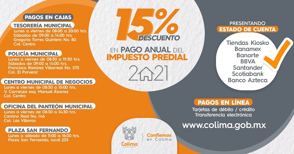 *La ciudadanía del municipio de Colima aún puede aprovechar el 15% de descuento por pago anticipado del impuesto predial 2021, durante todo el mes de enero