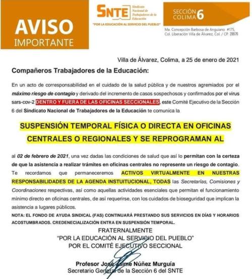 Debido a que Colima se encuentra “en máximo riesgo” (semáforo naranja) por la pandemia de Covid-19, la Sección 6 del Sindicato Nacional de Trabajadores de la Educación (SNTE) tomó la decisión de “Suspender temporalmente” sus actividades presenciales en oficinas centrales y delegacionales de dicha organización magisterial.