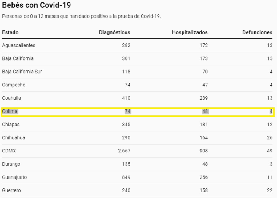 Un total de 4 (cuatro) bebés con edades que van de los 0 a los 12 meses de nacidos, han muerto en el estado de Colima a causa del Covid 19.