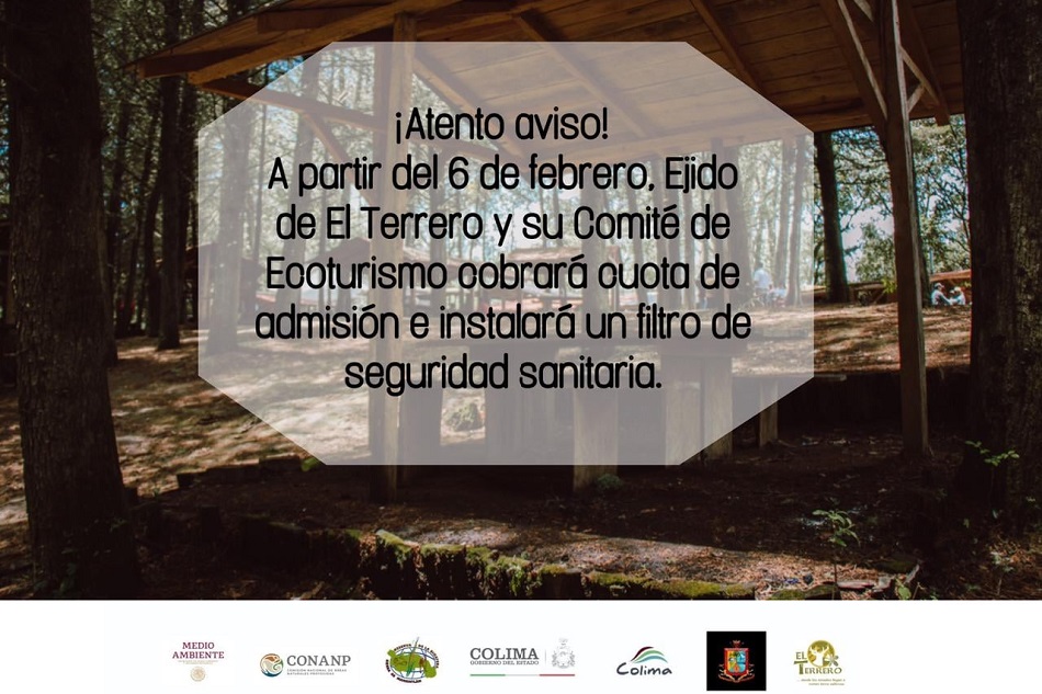 Minatitlán, Col. De acuerdo a la publicado en la Página de Facebook del Ayuntamiento de Minatitlán, Colima, por disposición oficial y en coordinación con los diferentes órdenes de gobierno, el Ejido de El Terrero, el Comité de Ecoturismo y la Secretaría de Turismo a partir del 6 de febrero estará cobrando una cuota de recuperación para ingresar a la comunidad, esto con el fin de generar recursos que ayuden a mejorar el área turística como miradores, pinitos, pago a guías, recurso para traslado de agua, etcétera.