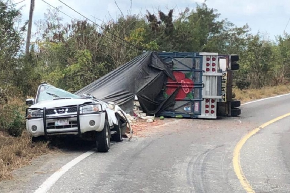 Aquila, Mich. Este miércoles, desde el municipio de Aquila, se reporta un aparatoso accidente vehicular ocurrido en la carretera federal México 200, la costera de Michoacán, en la zona de curvas horizontales y verticales del mirador de La Virgencita en su parte que baja hacia San Juan de Alima, en la curva de El Huizache, donde un camión Torton, que transportaba papaya, aplastó a una camioneta pick up con placas de Colima en la que viajaban varias personas.