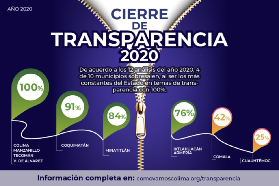 De acuerdo a los 12 análisis efectuados durante el año 2020, Colima, Manzanillo, Tecomán y Villa de Álvarez, sobresalen del resto pues son los 4 municipios más constantes del Estado en temas de transparencia, logrando un promedio anual de 100 por ciento. En el segundo lugar se encuentra Coquimatlán con un registro de 91 por ciento y cierra con la tercera posición, el ayuntamiento de Minatitlán con un resultado de 84 por ciento.