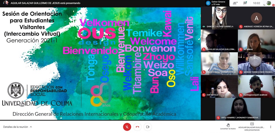 Este viernes, personal de la Dirección General de Relaciones Internacionales y Cooperación Académica de la Universidad de Colima, dio la bienvenida a 23 estudiantes de instituciones de educación superior extranjeras y del país, que cursarán de manera virtual el semestre febrero – julio 2021 en esta Casa de Estudios.