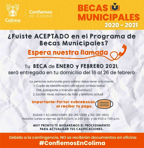 El Ayuntamiento de Colima informa que del 12 al 26 de febrero, los beneficiarios del Programa Becas Municipales, recibirán el apoyo económico en su domicilio.
