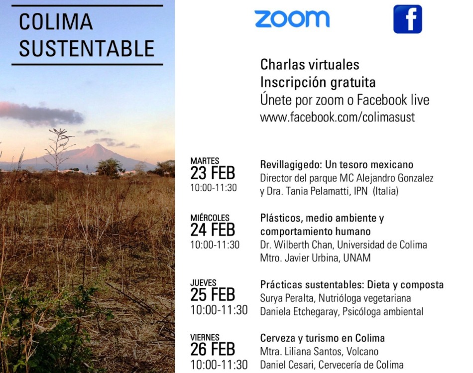 "Colima Sustentable" será transmitido vía internet ofreciendo charlas totalmente gratuitas, con previo registro personal a través de la aplicación Zoom en https://us02web.zoom.us/webinar/register/WN_Zz60F0WgTdKsBPSkdl2NOA y en Facebook live en www.facebook.com/colimasust