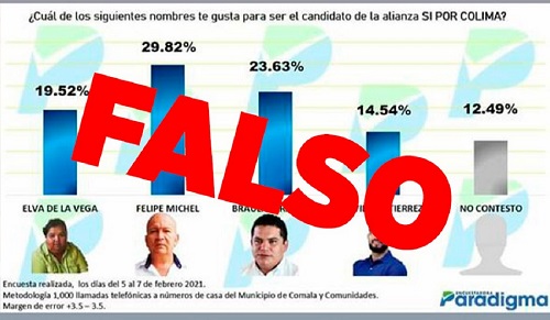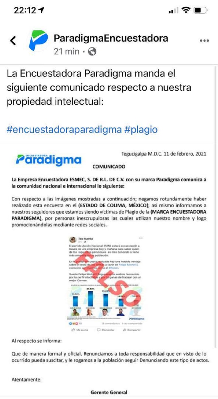 “Con respecto a la imagen mostrada a continuación, negamos rotundamente haber realizado la encuesta en el (ESTADO DE COLIMA, MEXICO), así mismo informamos a nuestros seguidores que estamos siendo víctimas de plagio de la (MARCA ENCUESTADORA PARADIGMA), por personas inescrupulosas, las cuales utilizan nuestro nombre y logo promocionándolas en redes sociales.